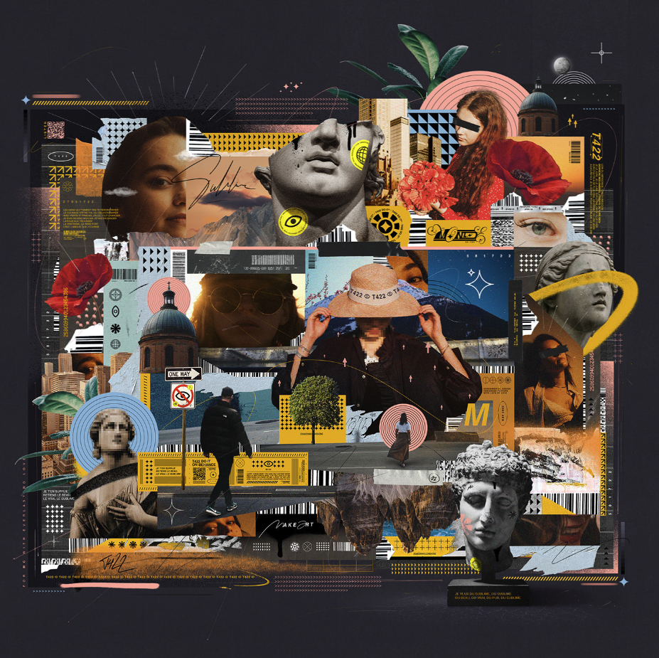 Similar elements like the round shapes, the colorful yellow are repeated across the piece.